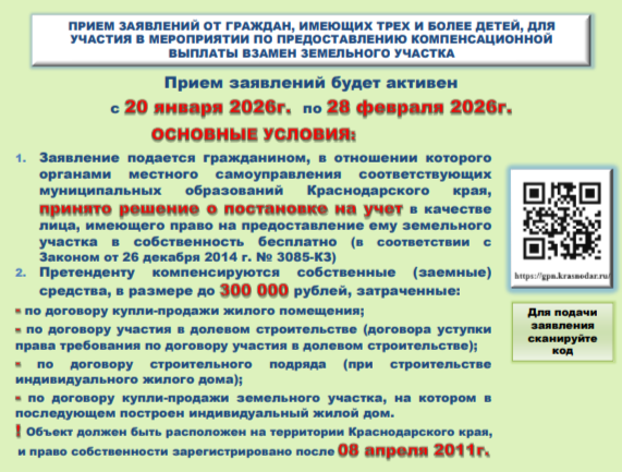 Прием заявлений от граждан, имеющих трех и более детей, для участия в мероприятии по предоставлению компенсационной выплаты взамен земельного участка