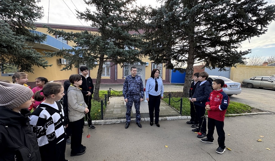 Начальник ОРЛС подполковник полиции Елена Владиславовна Асафьева совместно с сотрудниками филиала ФГКУ "УВО ВНГ России по Краснодарскому краю" , а также с учащимися 5 класса МОБУ СОШ № 15 ИМ. Н.И. Коробчака с. Ковалевского, возложили цветы к мемориалу и почтили память погибших минутой молчания.