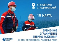 В связи с плановыми работами по предупредительному ремонту оборудования электросетевого комплекса 21 и 22 марта в станице Советской и 21 марта в хуторах Ленинский,  Тельман и Западный планируется локальное временное ограничение подачи электроэнергии