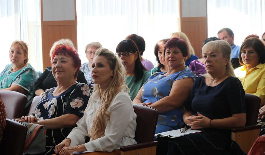 О ключевых стратегиях развития образования в Новокубанском районе в своем докладе подробно рассказала Диляра Тофиковна, подкрепив выступление фотопрезентацией. С 1 сентября в новые отремонтированные кабинеты, за школьные парты сядут 10126 школьников из них 1000 первоклассников, к своей педагогической деятельности приступят 1205 педагогов. За последние три года в педагогическую семью Новокубанского района влилось 103 педагога. Также речь шла о нововведениях в системе общего образования, финансировании отрасли образования, реализации региональных проектов «Современная школа», «Успех каждого ребенка», «Поддержка семей, имеющих детей», «Учитель будущего», «Цифровая образовательная среда» и национального проекта «Образование», о результатах сдачи ЕГЭ и ОГЭ, организации питания учащихся и преобразованиях в образовательных учреждениях района.