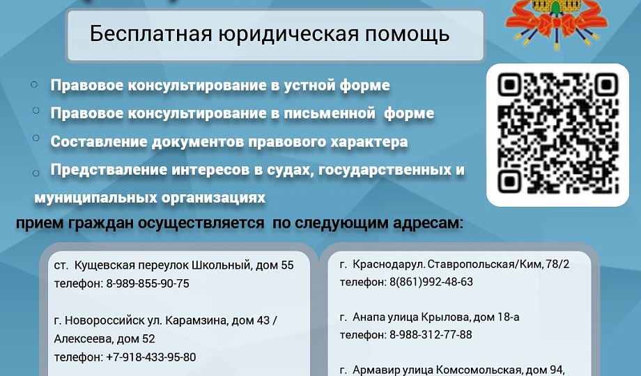 18 декабря 2024 года в период с 10 часов до 13 часов. в администрации муниципального образования Новокубанский район, по адресу: г. Новокубанск, ул. Первомайская, д.151 ГКУ КК «Государственное юридическое бюро Краснодарского края» проводит выездной день оказания бесплатной юридической помощи в режиме Онлайн для жителей Новокубанского района. Информация о порядке и способах оказания бесплатной юридической помощи населению размещена на официальном сайте администрации муниципального образования Новокубанский район (www.novokubanskiy.ru), а также на официальном сайте ГКУ КК «Государственное юридическое бюро Краснодарского края» ( www.gosurburo.krasnodar.ru)