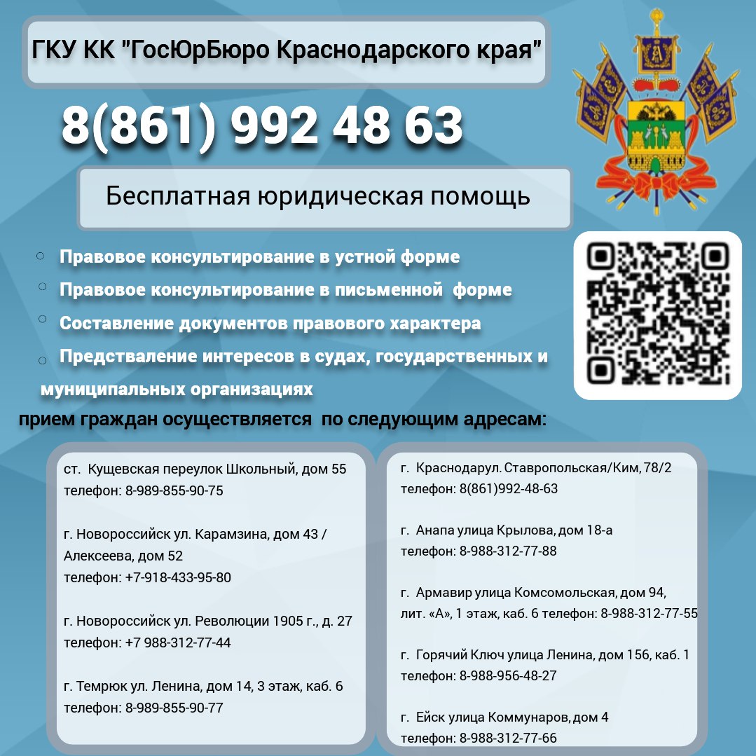 18 декабря 2024 года в период с 10 часов до 13 часов. в администрации муниципального образования Новокубанский район, по адресу: г. Новокубанск, ул. Первомайская, д.151 ГКУ КК «Государственное юридическое бюро Краснодарского края» проводит выездной день оказания бесплатной юридической помощи в режиме Онлайн для жителей Новокубанского района. Информация о порядке и способах оказания бесплатной юридической помощи населению размещена на официальном сайте администрации муниципального образования Новокубанский район (www.novokubanskiy.ru), а также на официальном сайте ГКУ КК «Государственное юридическое бюро Краснодарского края» ( www.gosurburo.krasnodar.ru)