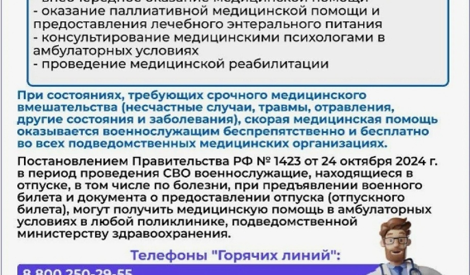 Также: по постановлению Правительства РФ №1423 от 24.10.2024 во время проведения СВО военнослужащие, находящиеся в отпуске (включая отпуск по болезни) могут получить помощь в любой поликлинике при предъявлении военного билета и документа об отпуске.