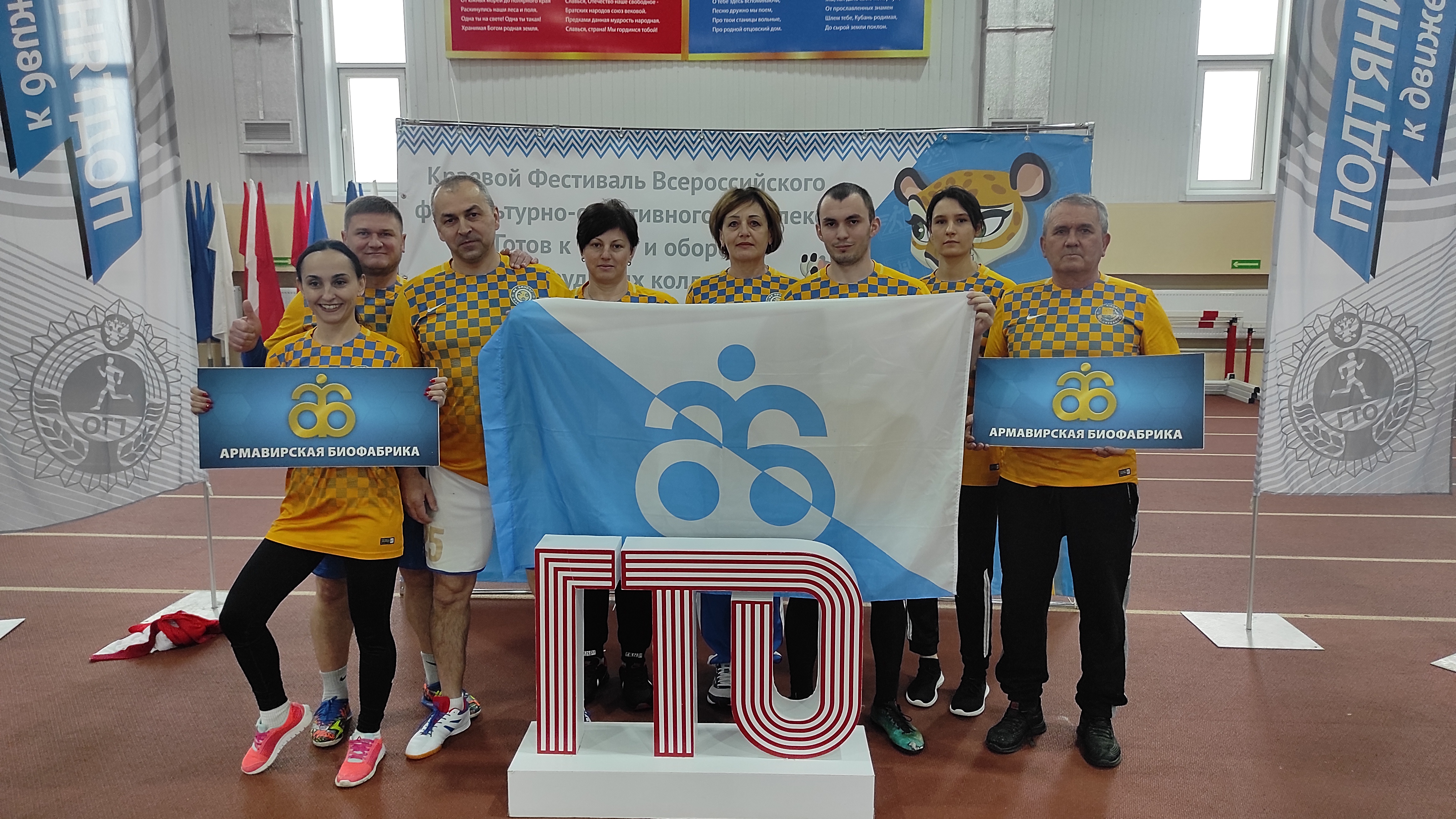 17 февраля в Славянске-на-Кубани прошел финал краевого фестиваля Всероссийского физкультурно-спортивного комплекса «Готов к труду и обороне» среди трудовых коллективов муниципальных образований Краснодарского края. Сразиться за звание лучшего приехало 26 команд. Честь Новокубанского района защищал коллектив ФКП «Армавирская биофабрика» под руководством Курбатова Владимира Дмитриевича, заместителя директора предприятия. Формат фестиваля предусматривал выявление быстрейшего в рамках командной эстафеты. Каждая команда состояла из 4 пар участников в разных возрастных категориях: от 25 до 34 лет, от 35 до 44 лет, от 45 до 54 лет и от 55 до 64 лет. В состав команды вошли: Ворсин Вячеслав, Белоусова Кристина, Бельсадский Анатолий, Бельсадская Наталья, Шевченко Андрей, Корчагина Яна, Гостенко Михаил и Казенюк Наталья.Участникам предстояло пройти 5 эстафетных станций: прыжок в длину с места, отжимания, бег с отягощением, пресс и приседание с гирей. На финишном рывке также было необходимо преодолеть легкоатлетические барьеры.