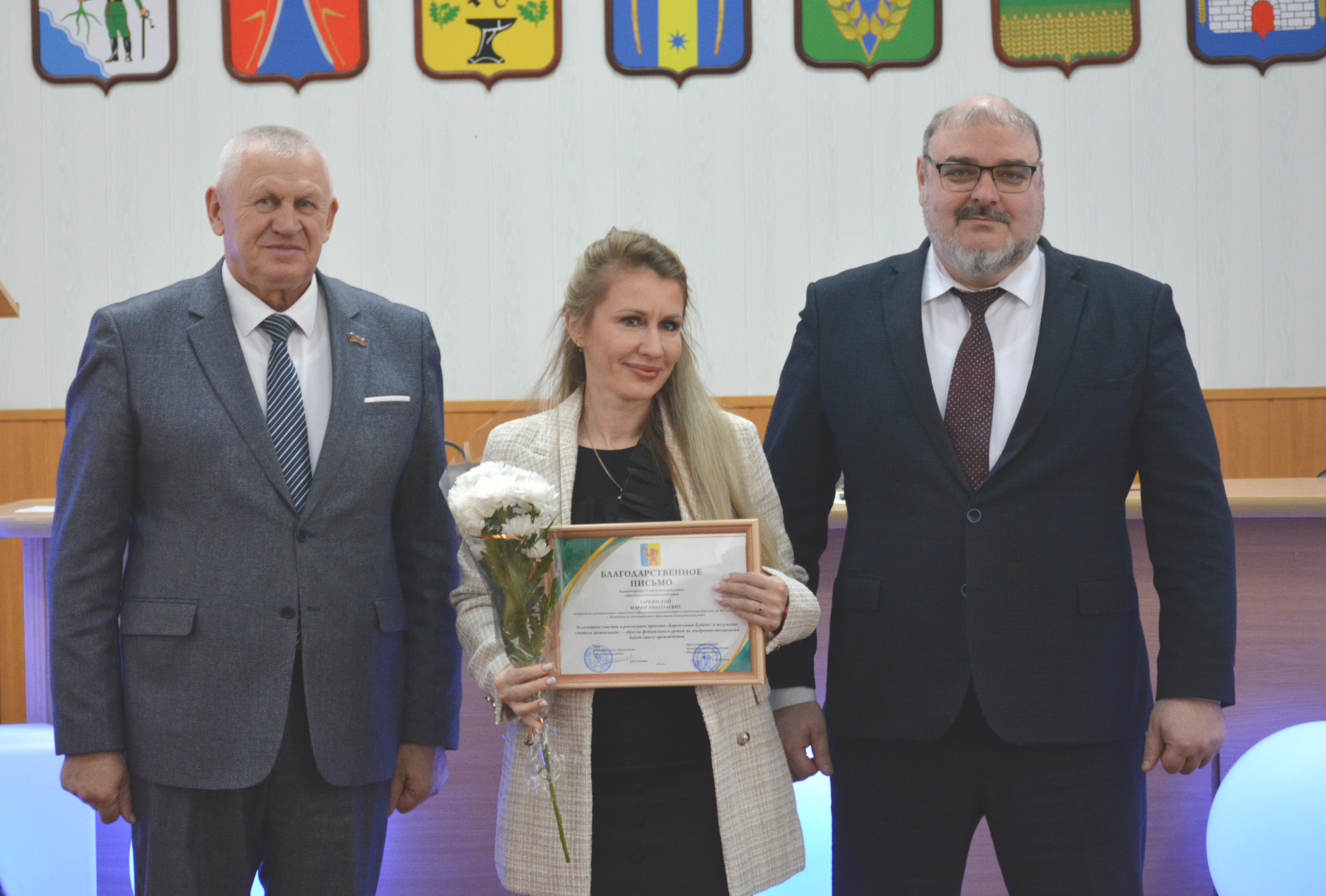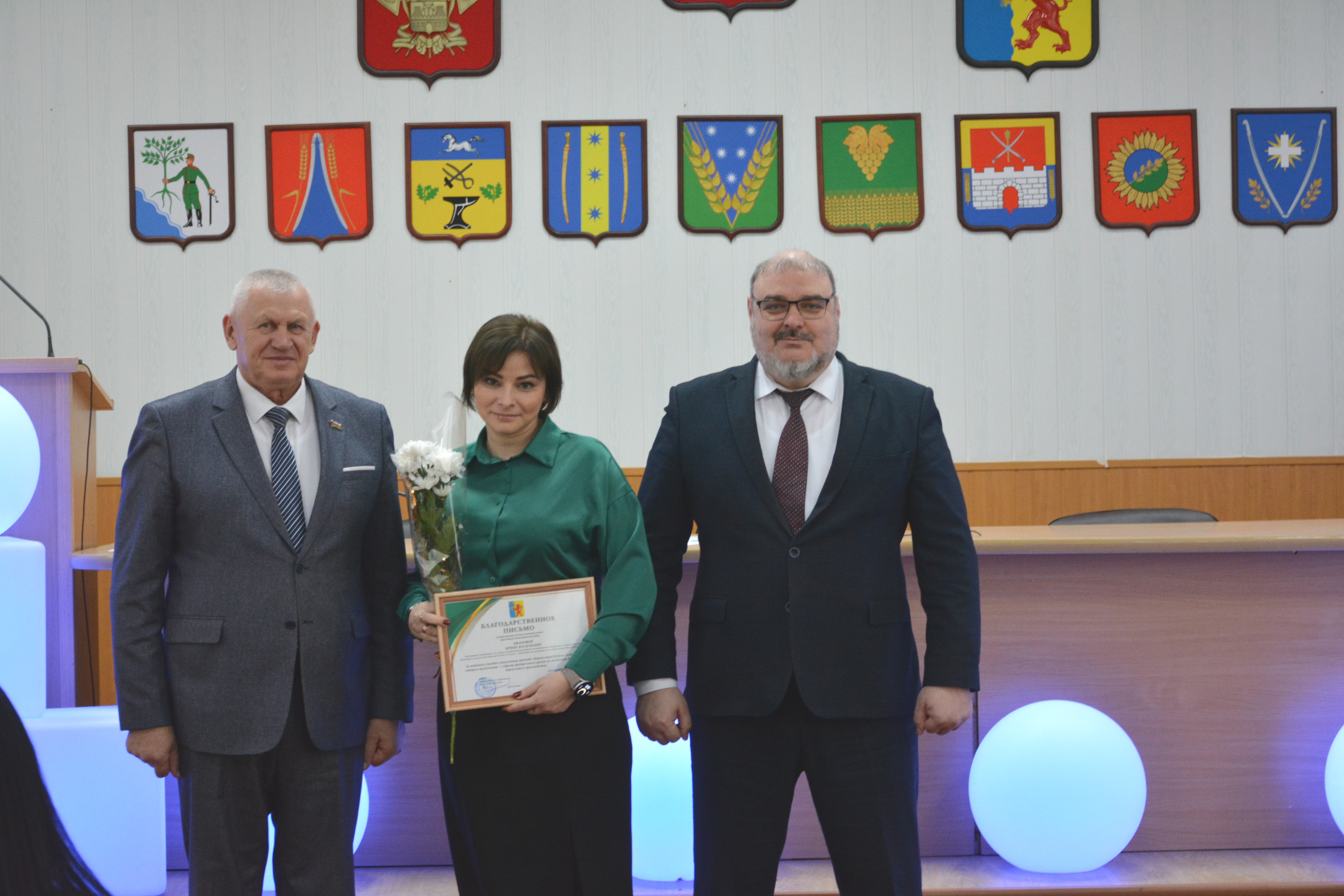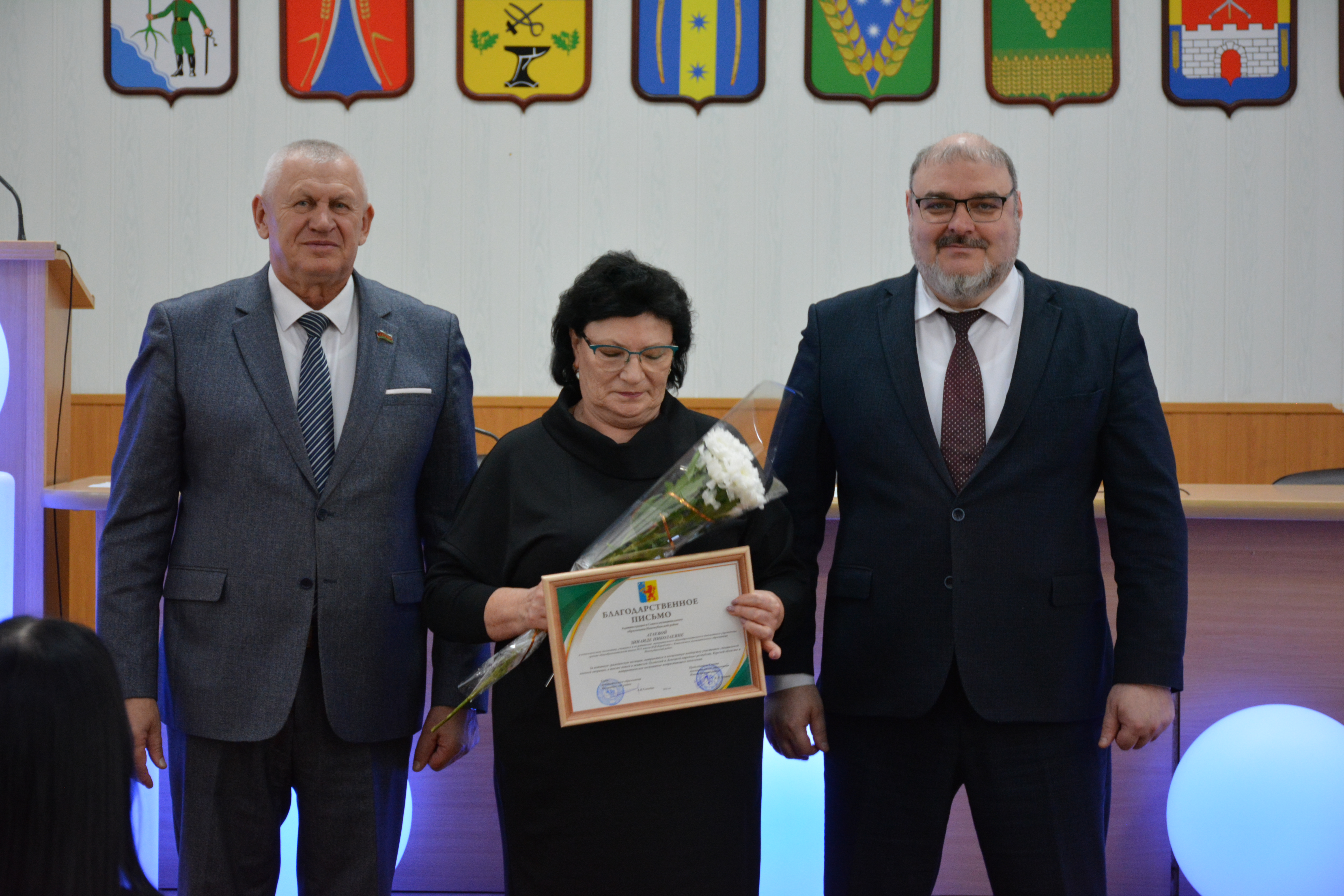 Александр Гомодин и Евгений Шутов поблагодарили всех сотрудников за совместную работу и вручили благодарственные письма администрации. 👏 Особое внимание уделили руководителям образовательных учреждений и индивидуальным предпринимателям за их большой вклад в патриотическое воспитание молодежи, а также за помощь участникам СВО и мирным жителям Донбасса.