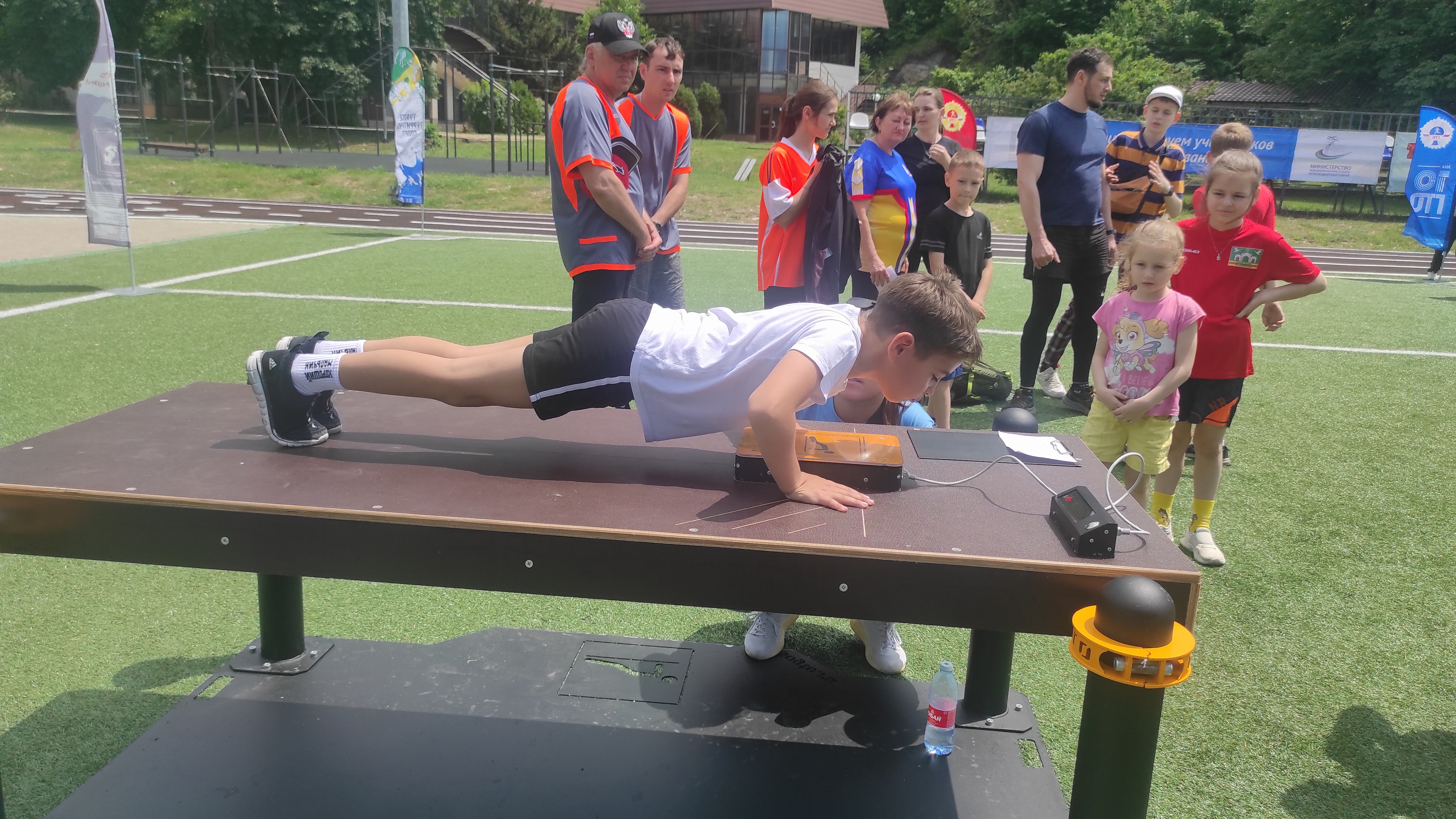 Мартин, Евгения и юный Михаил выполнили бег на короткую дистанцию, прыжок в длину, сгибание и разгибание рук в упоре лежа, наклон с гимнастической скамьи, а также поднимание туловища из положения лежа на спине.