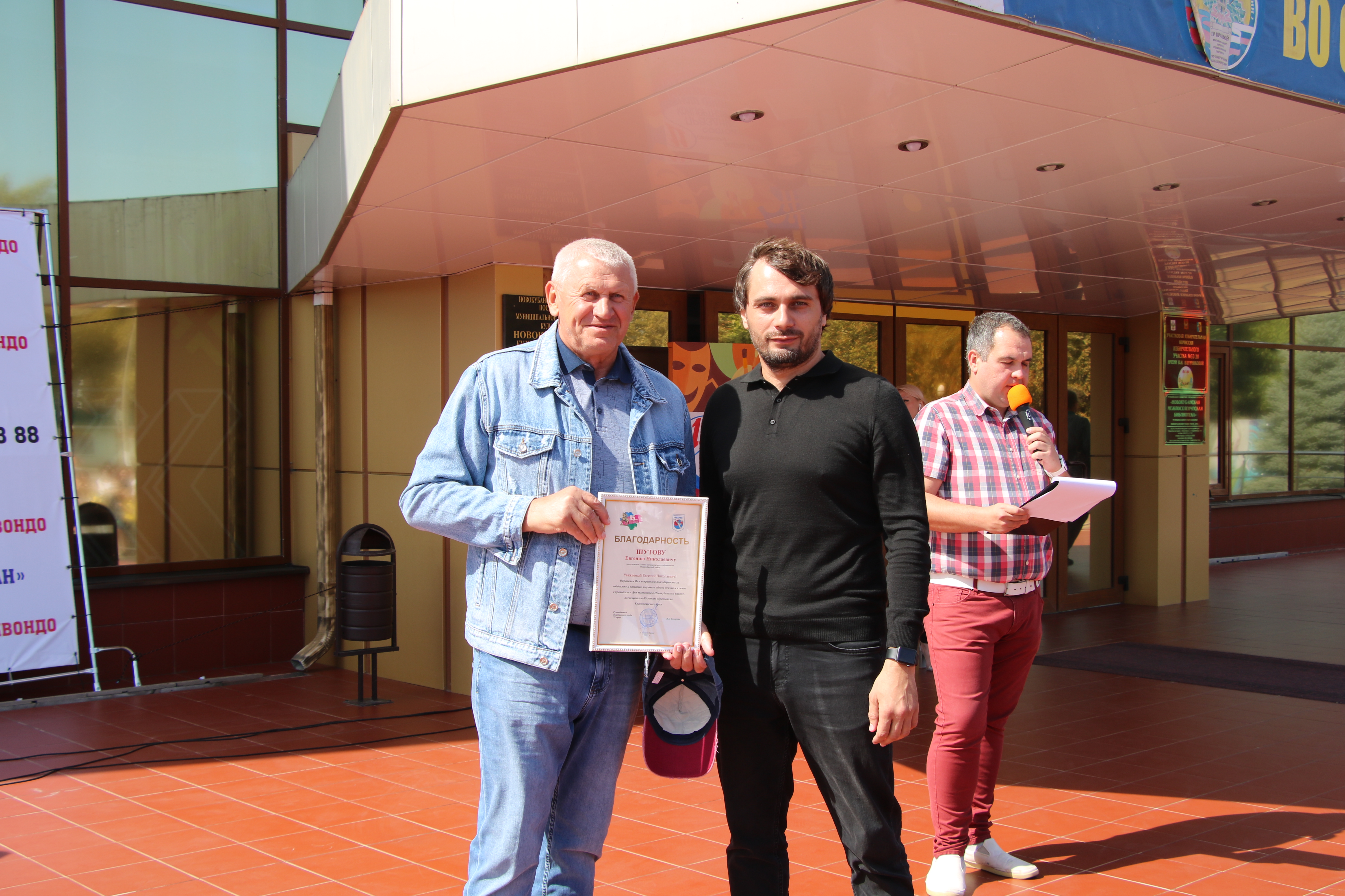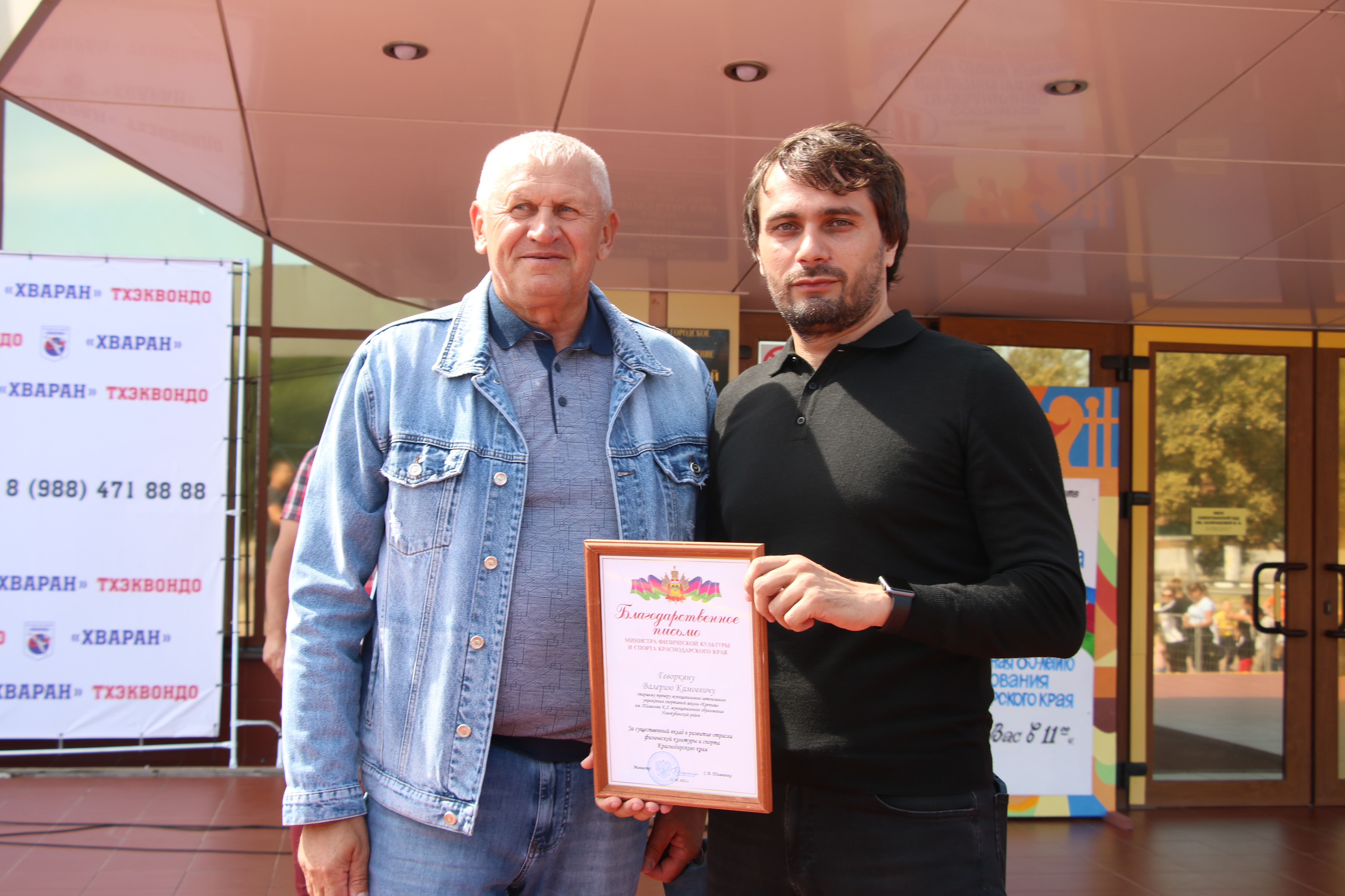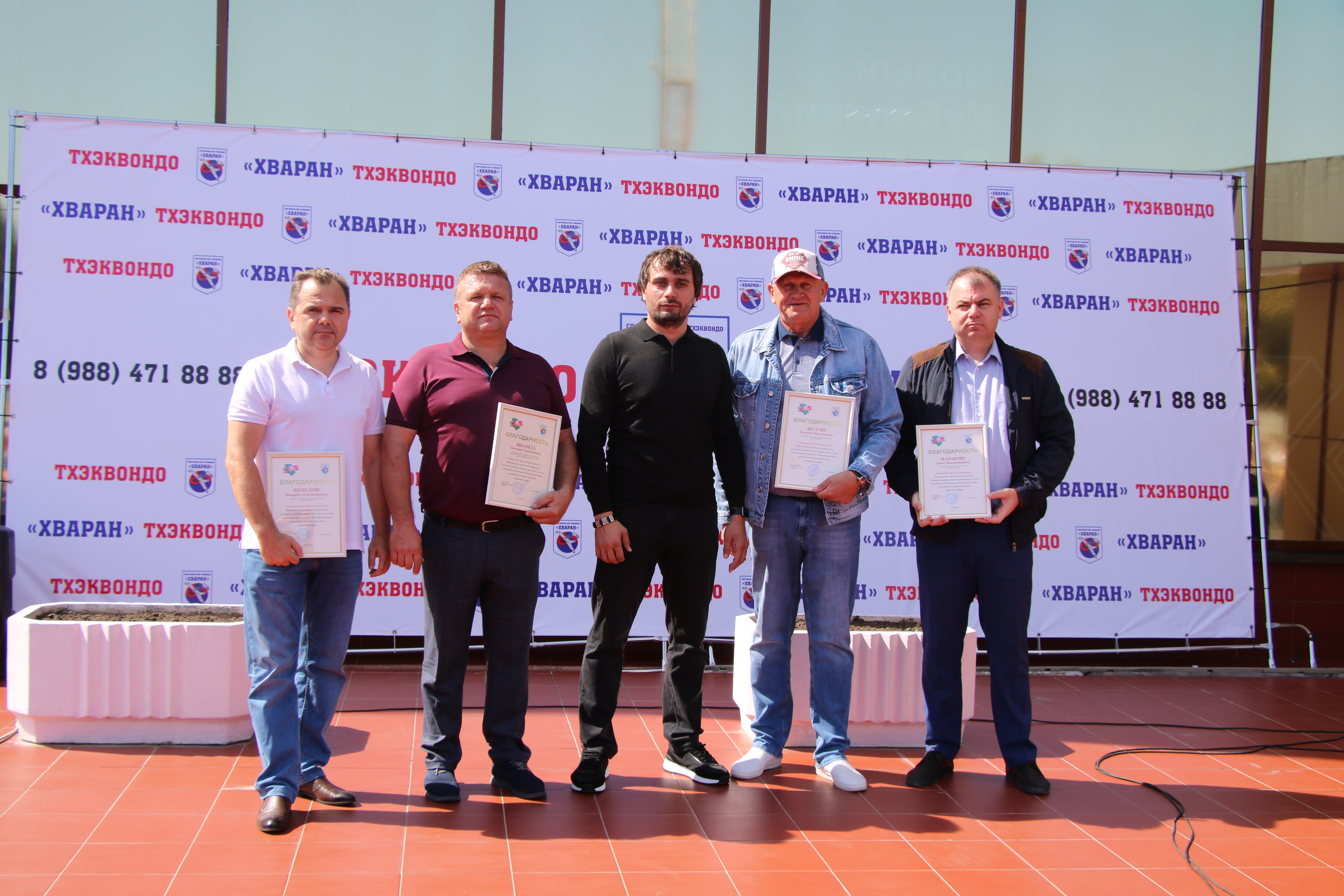 Руководитель спортивного клуба тхэквондо «Хваран», мастер спорта России, старший тренер сборной Краснодарского края Валерий Геворкян вручил благодарности почетным гостям мероприятия за весомую поддержку и помощь в развитии спортивного клуба тхэквондо «Хваран».