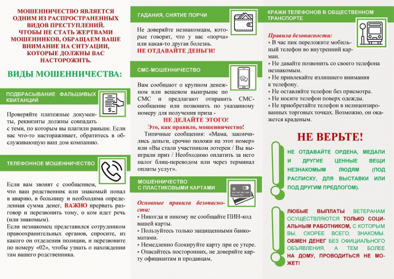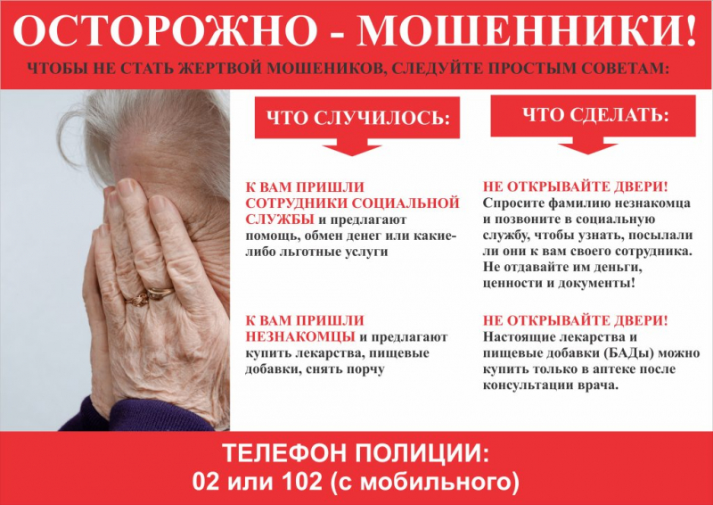 Не открывайте дверь! Спросите фамилию пришедшего и позвоните в социальную службу, чтобы узнать, отправляли ли они своего сотрудника к Вам. Не отдавайте им деньги, ценности и документы! Не отдавайте ордена, медали и другие ценные вещи незнакомым людям (под расписку, для выставки или под другим предлогом).
