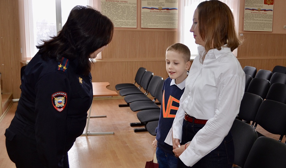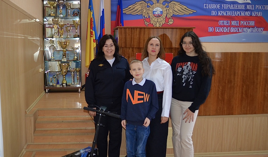 Торжественное вручение самоката состоялось в актовом зале Отдела МВД России по Новокубанскому району. Подарок вручили заместитель начальника-начальник ОРЛС подполковник полиции Елена Асафьева и общественники Татьяна Кобыльская и Андрей Пантюхин.