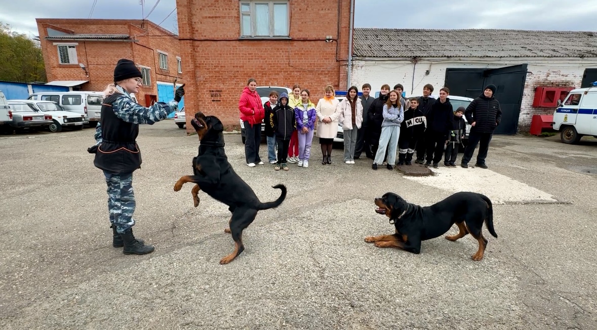 Так же сотрудники ГИБДД познакомили учащихся с особенностью работы инспектора дорожно-патрульной службы, рассказали о профессиональных требованиях к сотрудникам, обеспечивающим безопасность горожан на дорогах. Ребятам продемонстрировали программы, по которым осуществляется проверка водителей транспортного средства на месте. Кинолог кинологической службы сержант полиции Татьяна Лежнина познакомила школьников с двумя своими питомцами ротвейлерами по кличке «Орион» и «Бурбон» и рассказала секреты дрессировки, выработки поисковых навыков у животных.