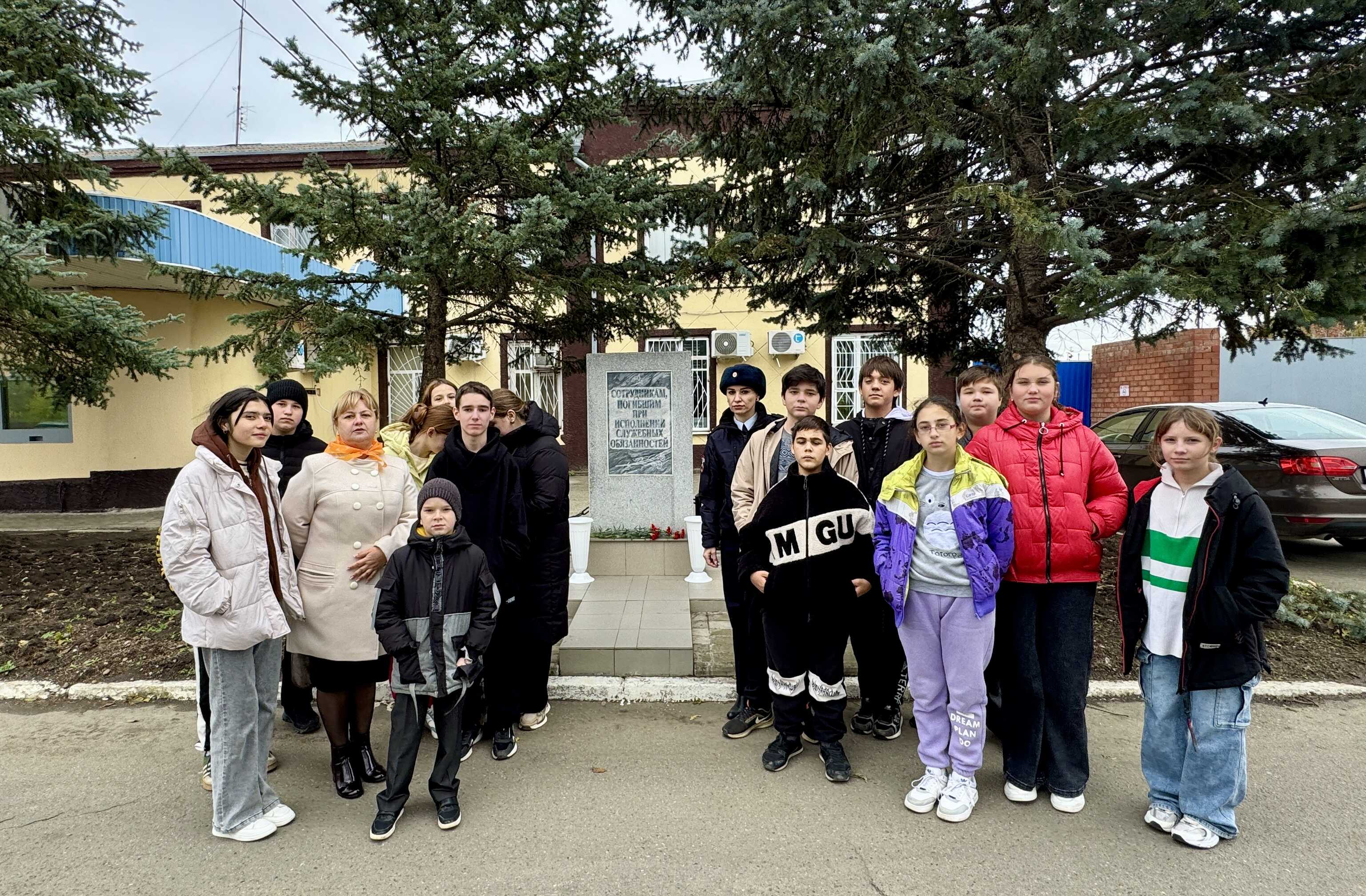 В завершении мероприятия специалист направления по связям со СМИ старший лейтенант внутренней службы Кристина Воронова с ребятами возложили цветы на памятник сотрудникам органов внутренних дел, погибшим при исполнении служебных обязанностей который был открыт 10 июня 2011 года на территории Отдела МВД России по Новокубанскому району.