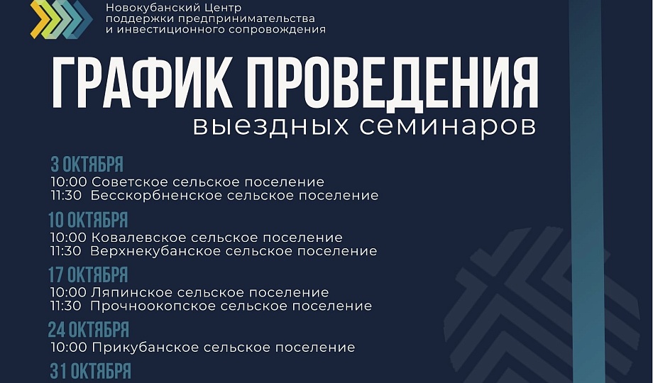 Новокубанский Центр поддержки предпринимательства проводит ежегодный цикл обучающих семинаров для предпринимателей и жителей Новокубанского района, заинтересованных в открытии и ведении собственного дела. Семинары пройдут на протяжении всего октября