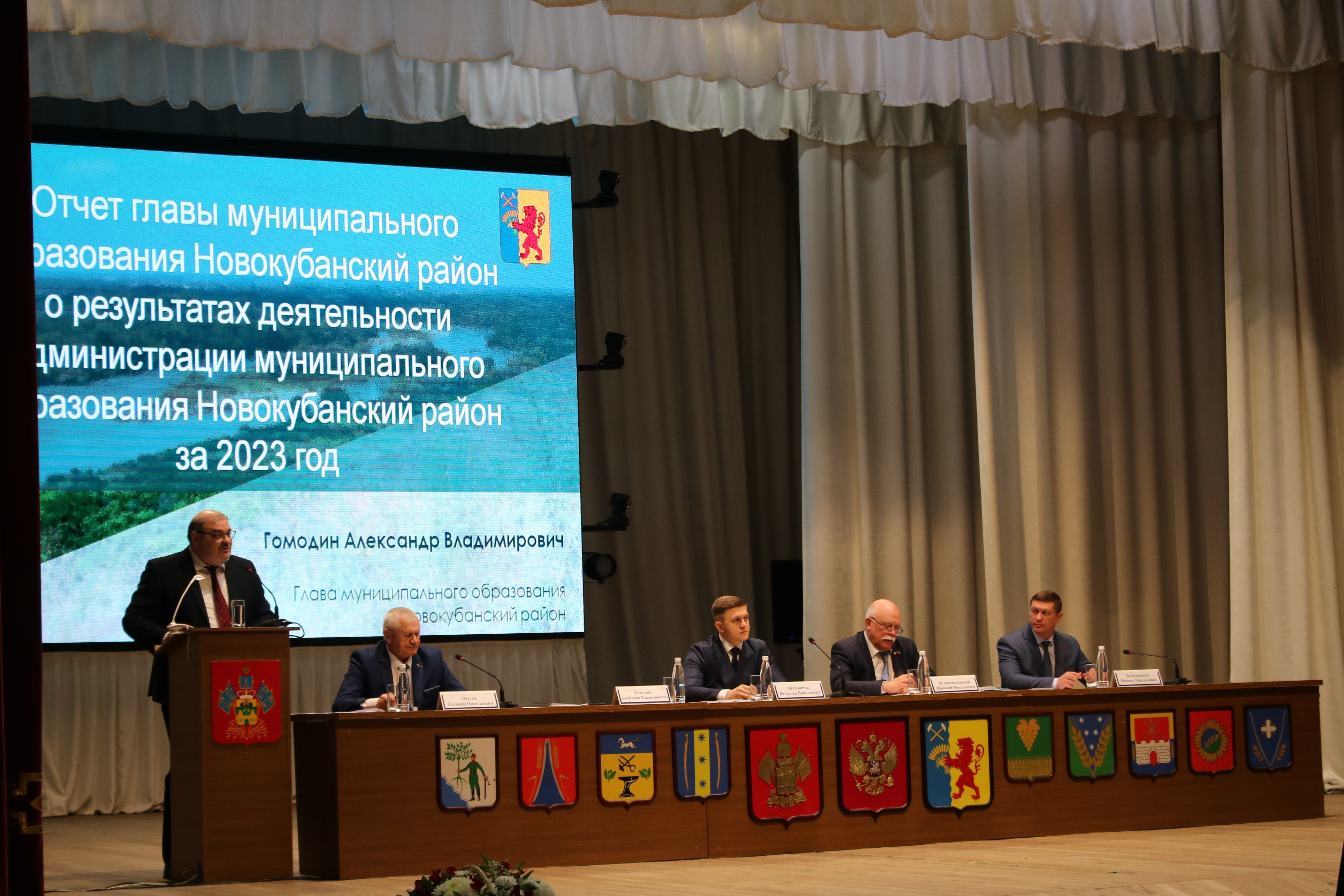 21.02.2024 Сегодня в МБУК "Новокубанский КДЦ" им.Наумчиковой В.И. глава района Александр Гомодин выступил с ежегодным отчетом о результатах своей деятельности и деятельности администрации муниципального образования Новокубанский район. В сессии также приняли участие временно исполняющий обязанности министра ТЭК и ЖКХ Краснодарского края Вячеслав Шапошник, депутаты Законодательного Собрания Краснодарского края Николай Петропавловский и Михаил Колодяжный.