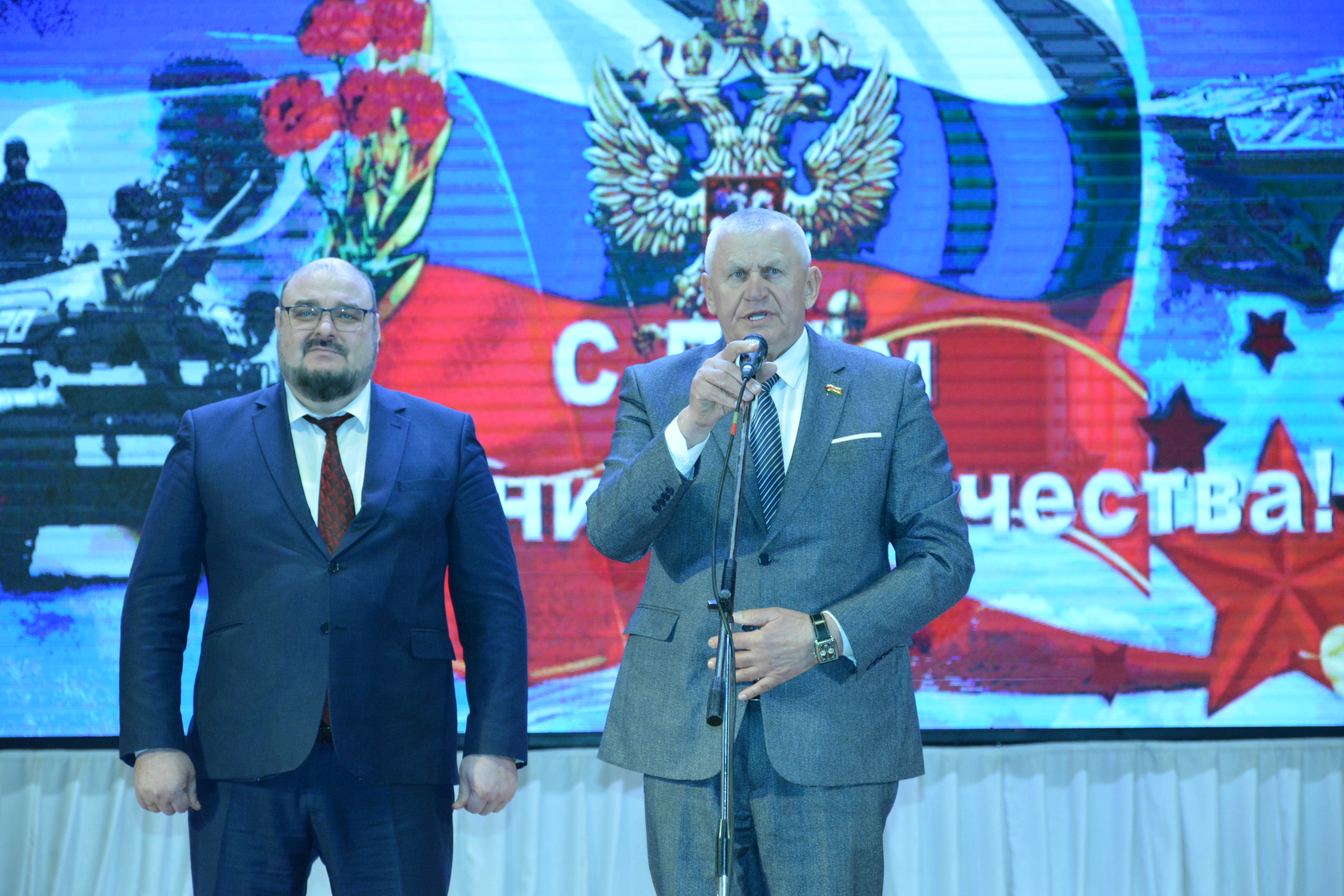 С праздничным приветствием на сцене выступили глава муниципального образования Новокубанский район Александр Владимирович Гомодин, председатель Совета муниципального образования Новокубанский район Евгений Николаевич Шутов, председатель Новокубанской районной организации ветеранов (пенсионеров, инвалидов) войны, труда, вооружённых сил и правоохранительных органов Михаил Васильевич Гуров.