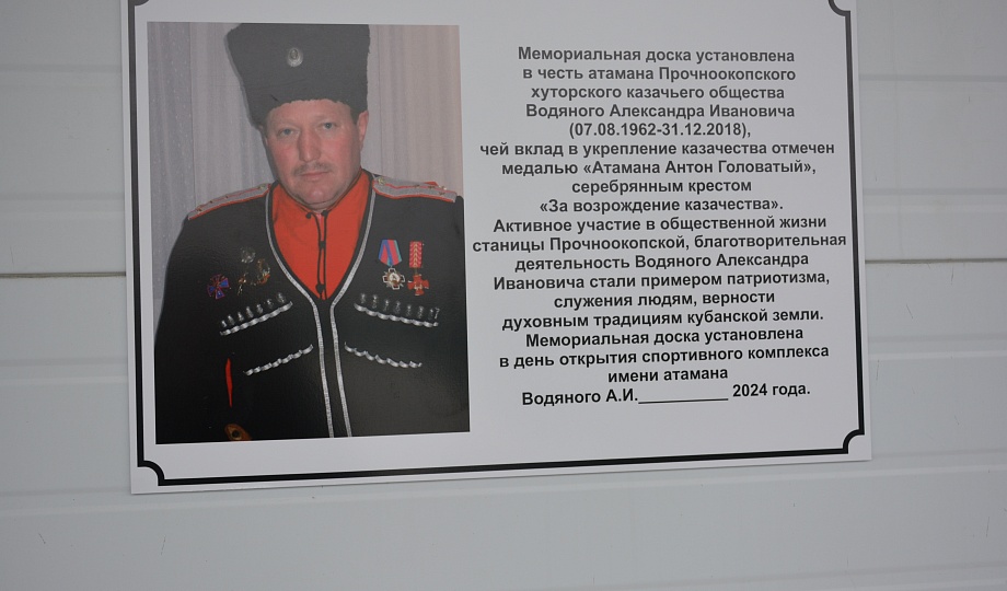 Сегодня состоялось торжественное мероприятие, посвящённого открытию спортивного комплекса «Казачья крепость» имени атамана Александра Ивановича Водяного Прочноокопского сельского поселения.
