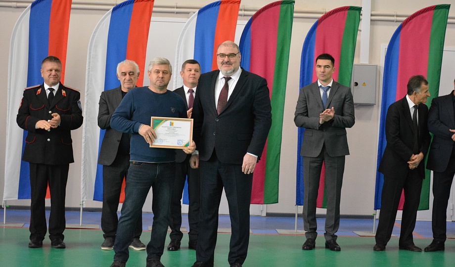 Благодарственными письмами администрации и Совета муниципального образования Новокубанский район за большой личный вклад в развитие физической культуры и спорта, строительство новых спортивных объектов, постоянное внимание к нравственному и физическому воспитанию населения Новокубанского района отметили тех, чей вклад в строительство данного объекта был неоценимым, тех, которые активно поддерживали проект и обеспечивали его реализацию.