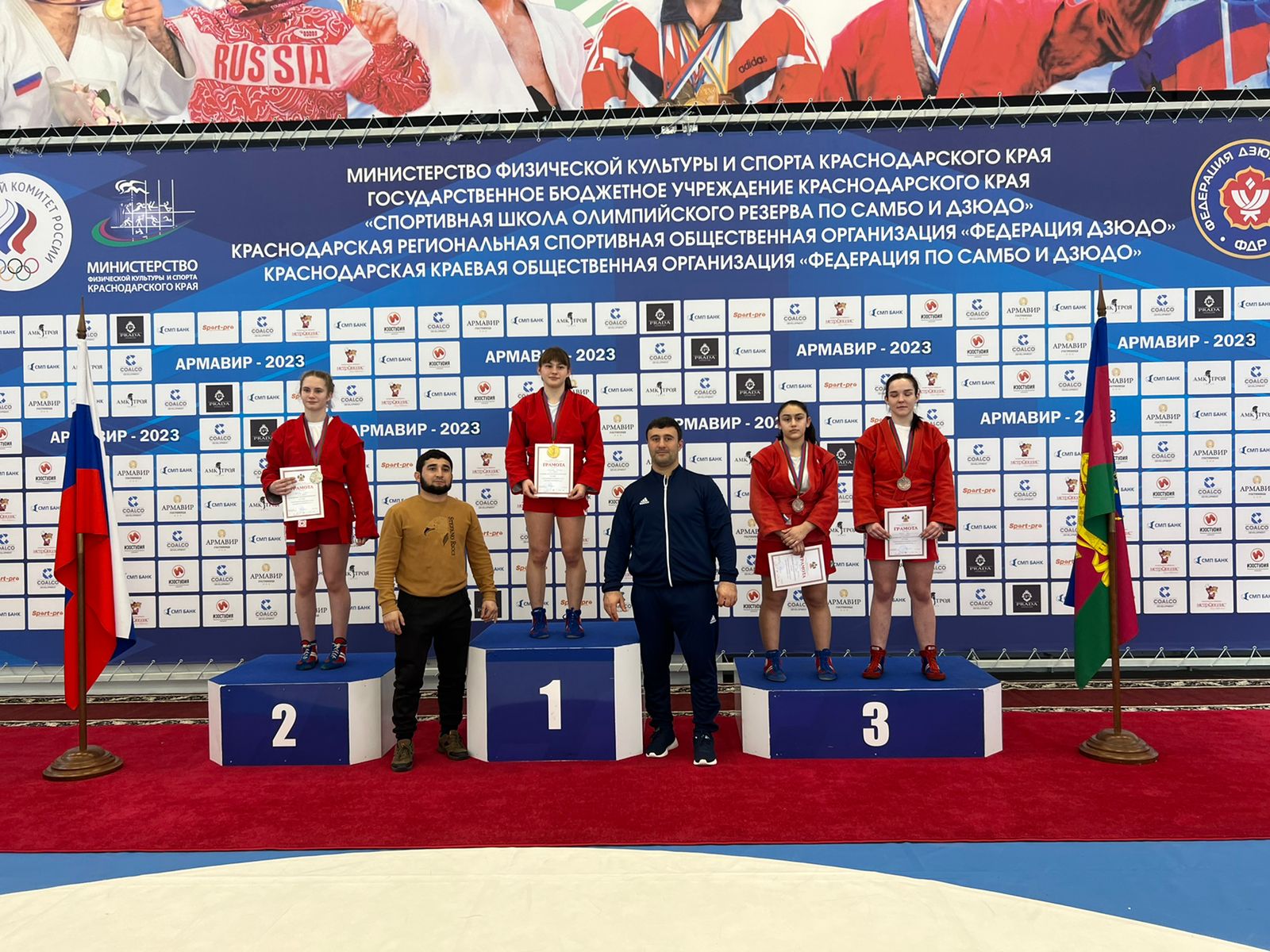 Серебро первенства завоевала Юлия Бургер (тренер-преподаватель Коневцова Татьяна Владимировна). Еще трое самбисток поднялись на третью ступень пьедестала почета: Кива Ева (тренер-преподаватель Коневцова Татьяна Владимировна) в весовой категории до 65 кг, Кажаурова Ангелина в весовой категории до 50 кг (тренер-преподаватель Коневцова Татьяна Владимировна) и Кульченко Элина (тренер-преподаватель Гешев Джамбулат Андзорович) весовой категории до 54 кг.