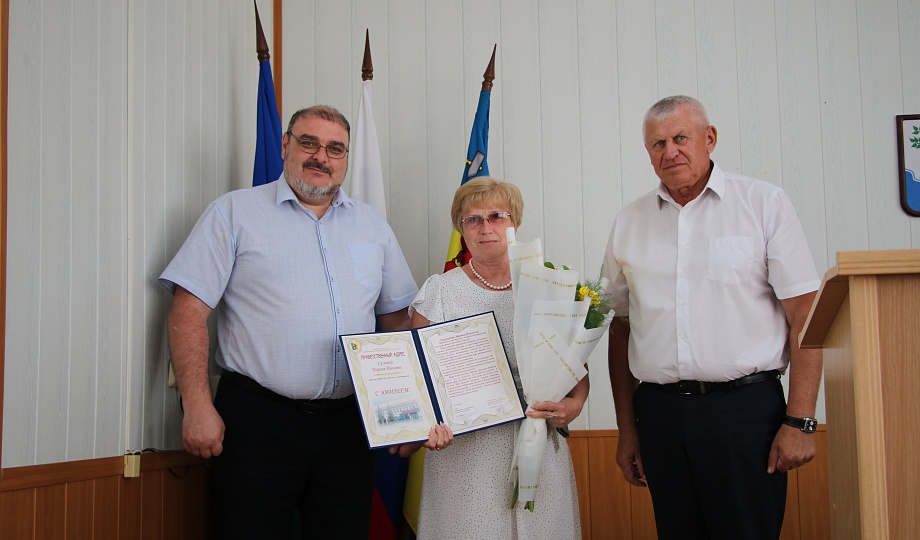 Планерное совещание завершилось на торжественной ноте: глава муниципалитета Александр Гомодин и председатель районного Совета депутатов поздравили с юбилейным днем рождения директора МДБУ № 7 «Ласточка» ст.Прочноокопской Марину Сослову.