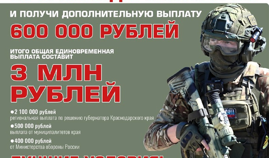 Единовременная выплата только в Краснодарском крае: 3 млн. рублей, из них: