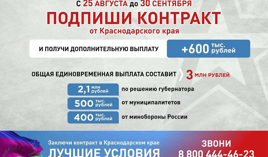 Единовременная выплата только в Краснодарском крае: 3 млн. рублей, из них:
