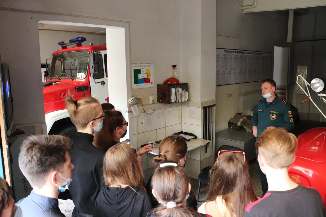 Вторым пунктом выездного маршрута в этот день стала экскурсия на пожарную часть №124 г. Новокубанска. Волонтерам провели инструктаж о том, как ликвидировать пожар и ознакомили с необходимыми мерами предосторожности. В ходе занятия были продемонстрированы машины и спец. форма пожарных, дана возможность пострелять из пожарного ствола -брандспойта. Экскурсию провел заместитель начальника 124 пожарно-спасательной части Сергей Сергеевич Карпенко.