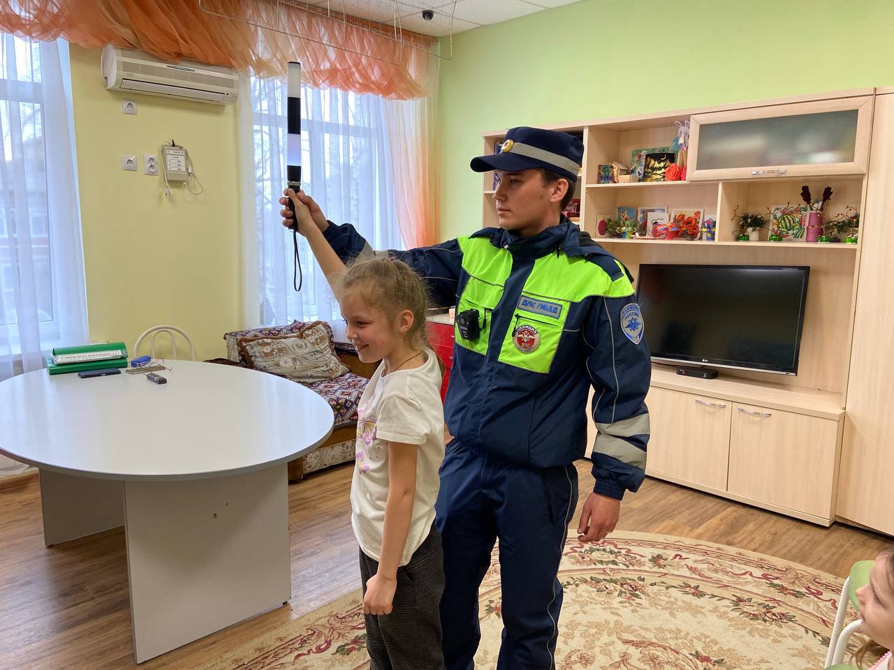 Также инспектор ДПС наглядно продемонстрировал ребятам для чего и как используется служебный жезл. Позже каждому ребенку представилась возможность попробовать себя в роли автоинспектора.