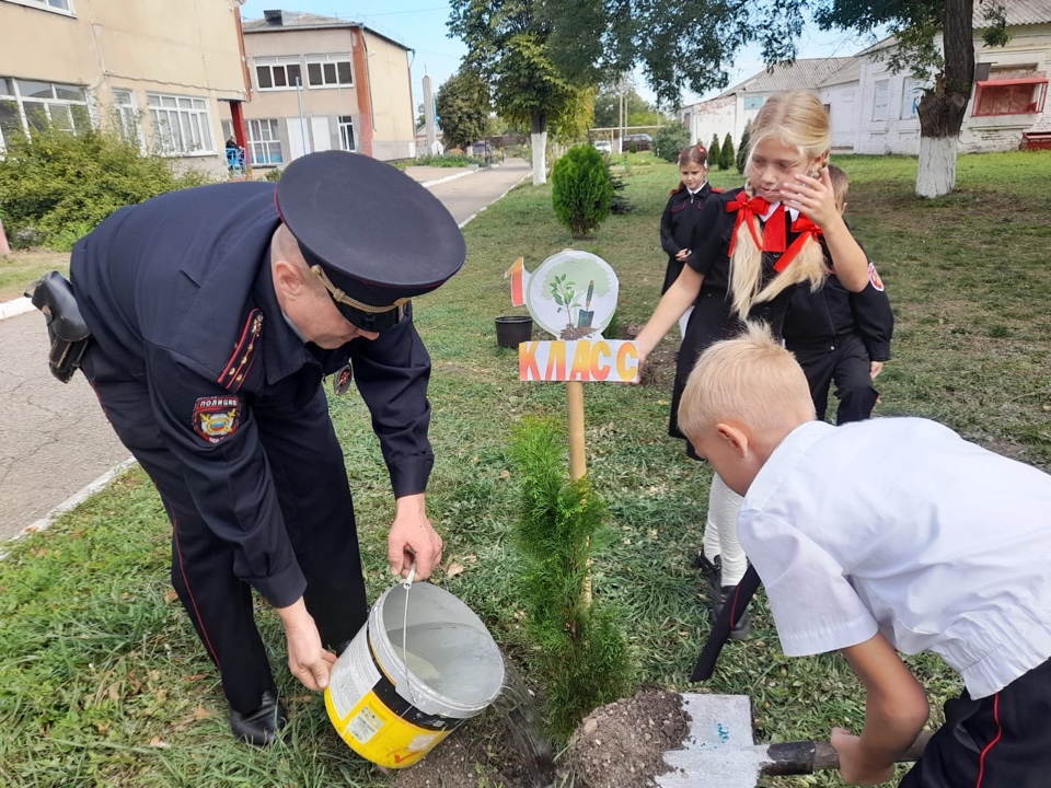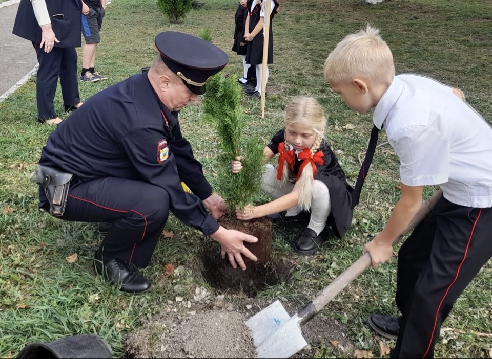 В рамках акции учащиеся 1 класса МОБУООШ № 12 им. К.А. Флеер с. Новосельского, с классным руководителем Татьяной Кулик, советником директора по воспитанию и взаимодействию с детскими общественными объединениями Натальей Роот и участковым уполномоченным Отдела МВД России по Новокубанскому району капитаном полиции Евгением Кашиным высадили на территории школы хвойные деревья.