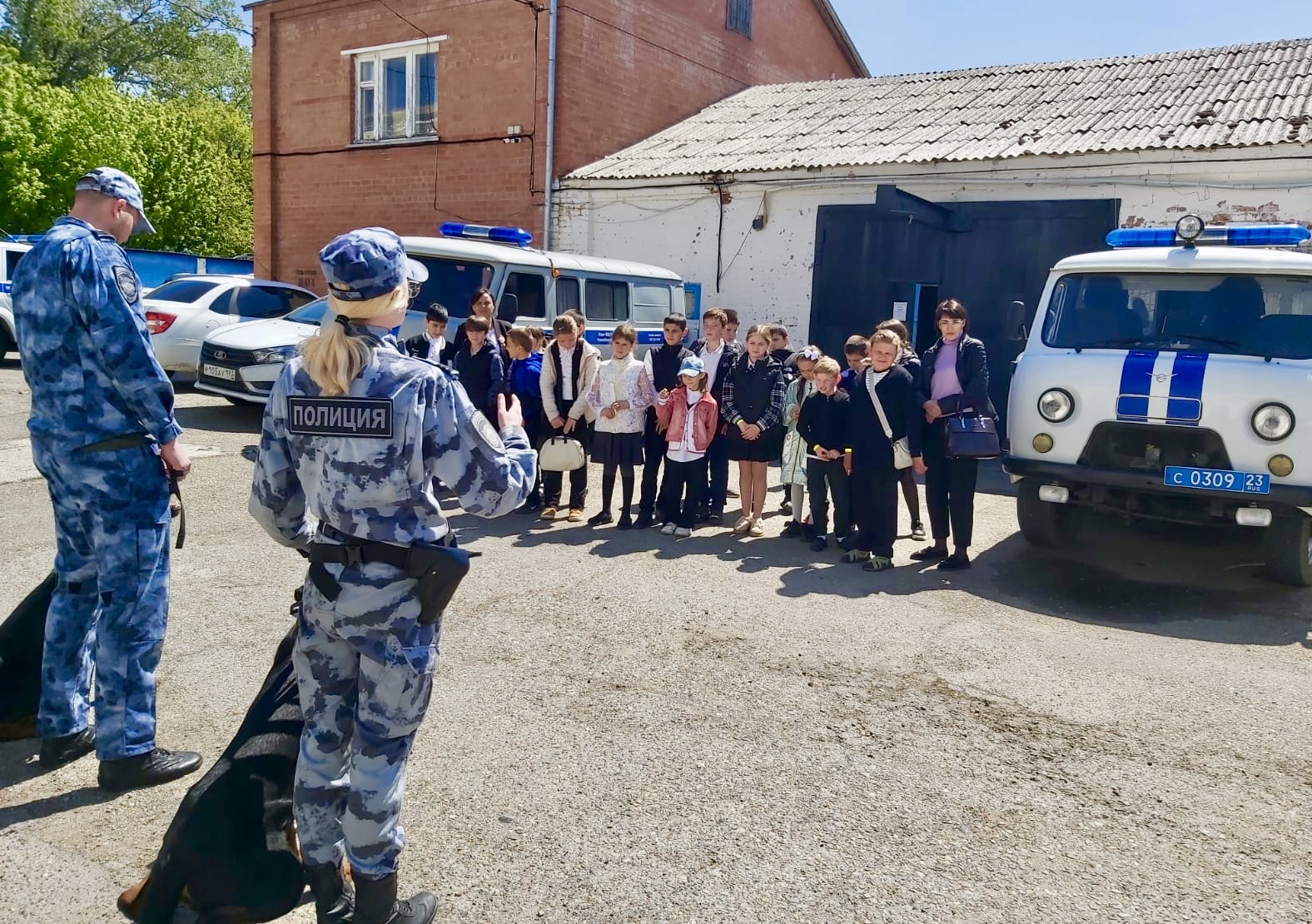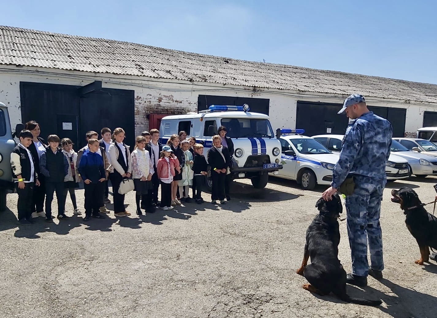 Кинологи устроили показательные выступления служебных собак. Школьникам продемонстрировали основы дрессировки. Ребята поинтересовались, с какого возраста можно обучать собаку, какие команды четвероногие должные освоить в первую очередь и как правильно кормить собак.