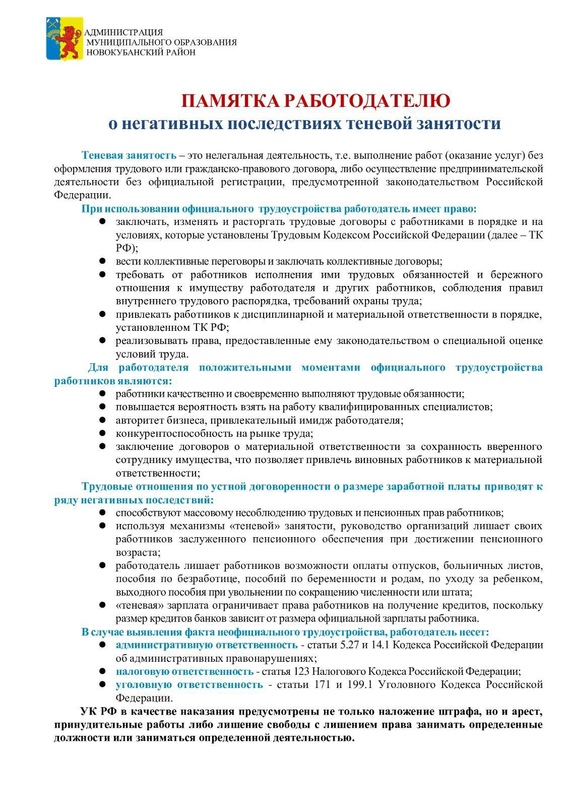 Памятка работодателю о негативных последствиях теневой занятости