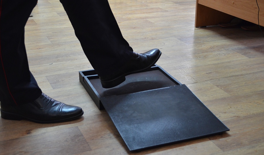 Работать с прибором очень просто: на дне устройства чистый бланк бутокарты, отсеки для валика и раскатки. В подвижной части рамки натянута ткань. Нанеся дактилоскопическую краску на внутреннюю поверхность этой ткани, эксперт закрывает рамку и просит проверяемое лицо сделать шаг и наступить на ткань в рамке, получается отпечаток обуви, который вносится в базу и сравнивается по трасологическим учетам следов подошв обуви.