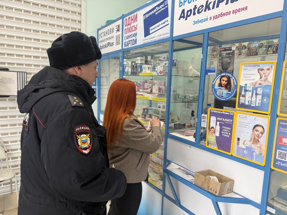 Полицейские вручили сотрудникам аптек профилактические памятки, которых наглядно изложены: уголовная и административная ответственность за реализацию безрецептурных лекарственных препаратов, в том числе несовершеннолетним (ст. 234.1 УК РФ «Незаконный оборот сильнодействующих или ядовитых веществ», ст. 6.16 КоАП РФ «Нарушение правил оборота наркотических средств, психотропных веществ»), контактные телефоны для оперативного сообщения о подозрительных покупателях или попытках сбыта.