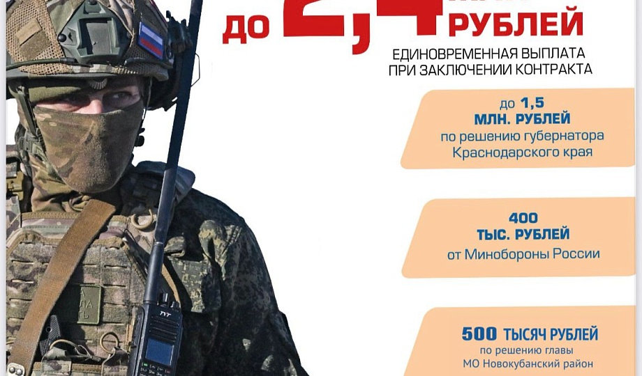 Единовременные выплаты для военнослужащих по контракту с 01 июня 2025 года составляют 2 миллиона 400 тысяч рублей, предусмотрен полный пакет социальных льгот и гарантий для военнослужащих-участников СВО и членов их семей (в том числе для детей военнослужащих поступление в учебные заведения высшего и среднего профессионального образования в рамках установленных квот), налоговые льготы и кредитные каникулы.