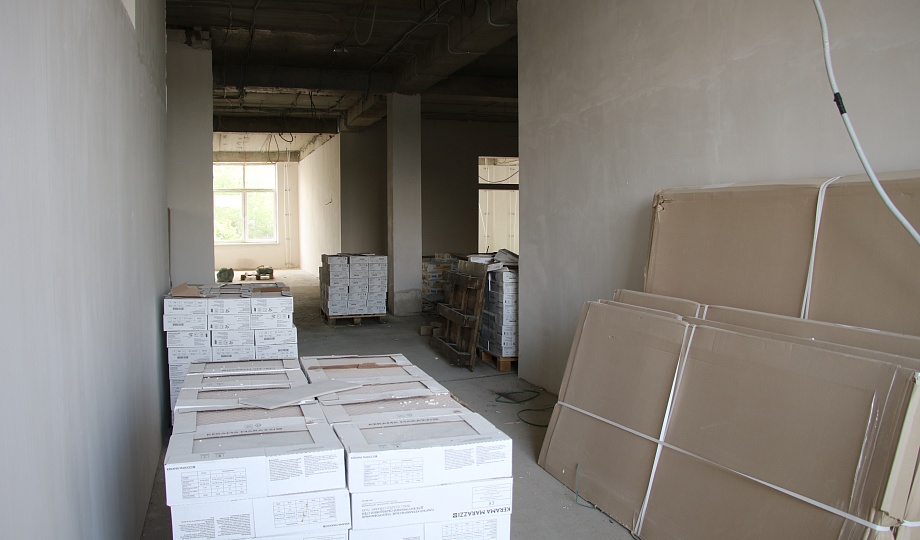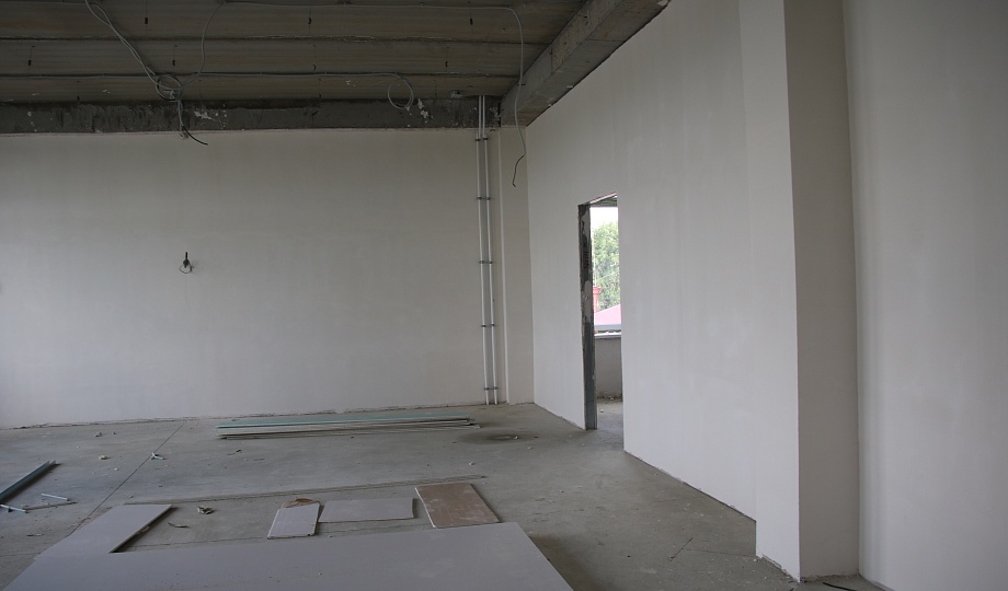 Со времени прошлого посещения строительной площадки 4 мая сделано многое. Закончены работы по возведению фасадов, ведутся отделочные работы на первом и втором этажах, в частности завершена облицовка плиткой помещений пищеблока, рабочие приступили к планировке помещений третьего этажа. К концу недели завершатся работы по возведению лесов на крыше и укладке изоляционного материала. Также стартовали работы по благоустройству территории.