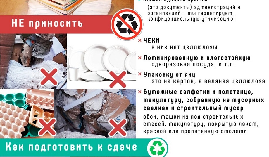 Вторичной переработке подлежат: глянцевые журналы, газеты, офисная бумага, тетради, крафт бумага, бумажная упаковка, книги, не представляющие литературной ценности и т.п.